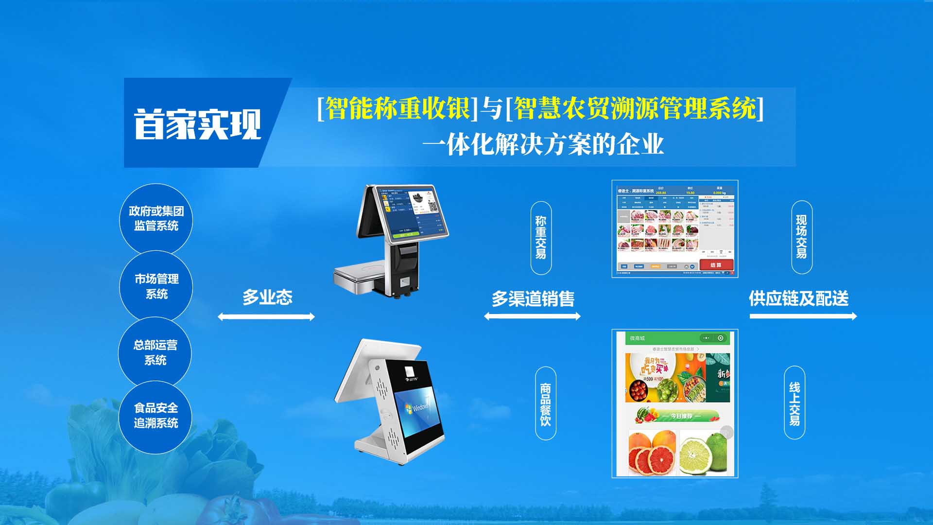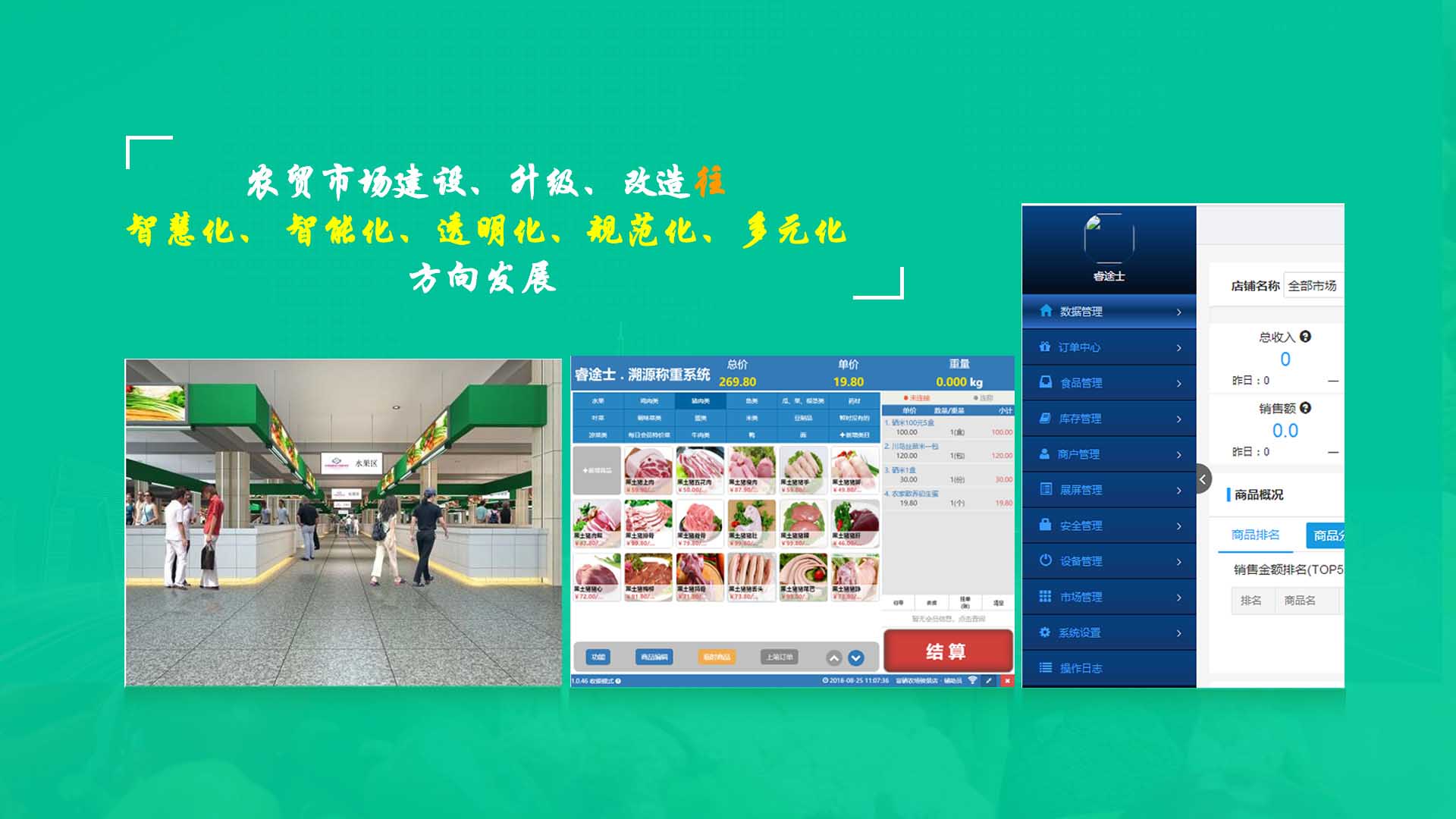創(chuàng)新實現(xiàn)了【智慧農(nóng)貿(mào)溯源管理系統(tǒng)】與【智能稱重收銀】一體化解決方案,集市場管理、運營管理、溯源追溯、智能收銀大數(shù)據(jù)運用于一體,硬件、軟件與管理系統(tǒng)完美結合。適用于農(nóng)批、農(nóng)貿(mào)市場蔬菜、生鮮、水果、水產(chǎn)、肉類、熟食等稱重和非稱重銷售;由于采用一體化設計,解決了傳統(tǒng)農(nóng)貿(mào)市場無法實現(xiàn)的信息化、智能化、可追溯的管理問題;使稱重、收銀、追溯、管理、更透明、公正、安全,讓顧客無后顧之憂,給管理工作帶來極大的便捷與高效,對國內(nèi)農(nóng)產(chǎn)品行業(yè)的發(fā)展、農(nóng)產(chǎn)品流通管理起到了典范作用。 【睿途士首創(chuàng)】顛覆傳統(tǒng)的“智慧農(nóng)貿(mào)市場系統(tǒng)”,解決了傳統(tǒng)農(nóng)貿(mào)系統(tǒng)單一安卓掛屏,昂視不方便看、不直觀、無互動性,傳輸信息不齊全、不穩(wěn)定的問題,也解決了按鍵電子秤商品難找、商品代碼難記、按鍵操作不靈活、支付不智能,對收銀管理、銷售商品、菜名、菜價、打折、優(yōu)惠、會員、線上下單、采購等無法實現(xiàn)實際菜品交易和追溯等問題。 更具顛覆性的是睿途士智慧系統(tǒng)擁有三大管理平臺(市場管理平臺、總部運營管理平臺、商戶后臺管理平臺)、一個可視操作前臺和三大追溯功能,讓遠程管理、數(shù)據(jù)傳輸、人機互動、智能控制、移動支付、大數(shù)據(jù)、互聯(lián)通信、云端存儲、人工智能、智能城市、電子定位、智能收銀等功能得以實現(xiàn)。